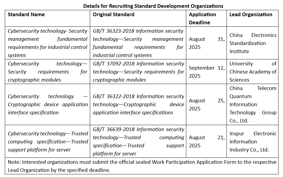 Furthermore, for the purpose of continuously improve the standard framework, TC260 initiated the revision of four national standards in key domains and is openly soliciting participating entities. These revisions focus on critical areas related to national security and socioeconomic development and the relevant details about the solicitation are shown in the table below.